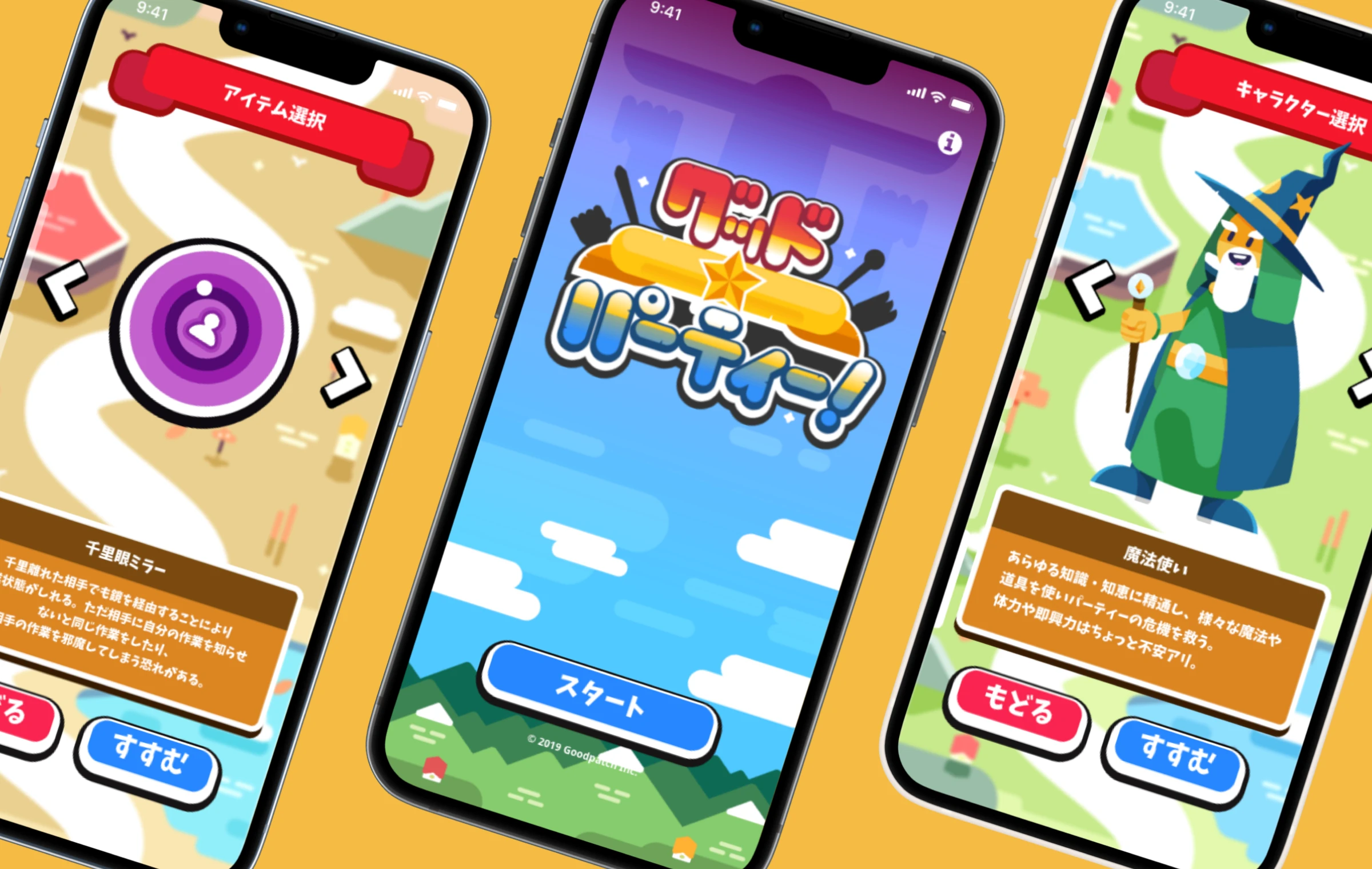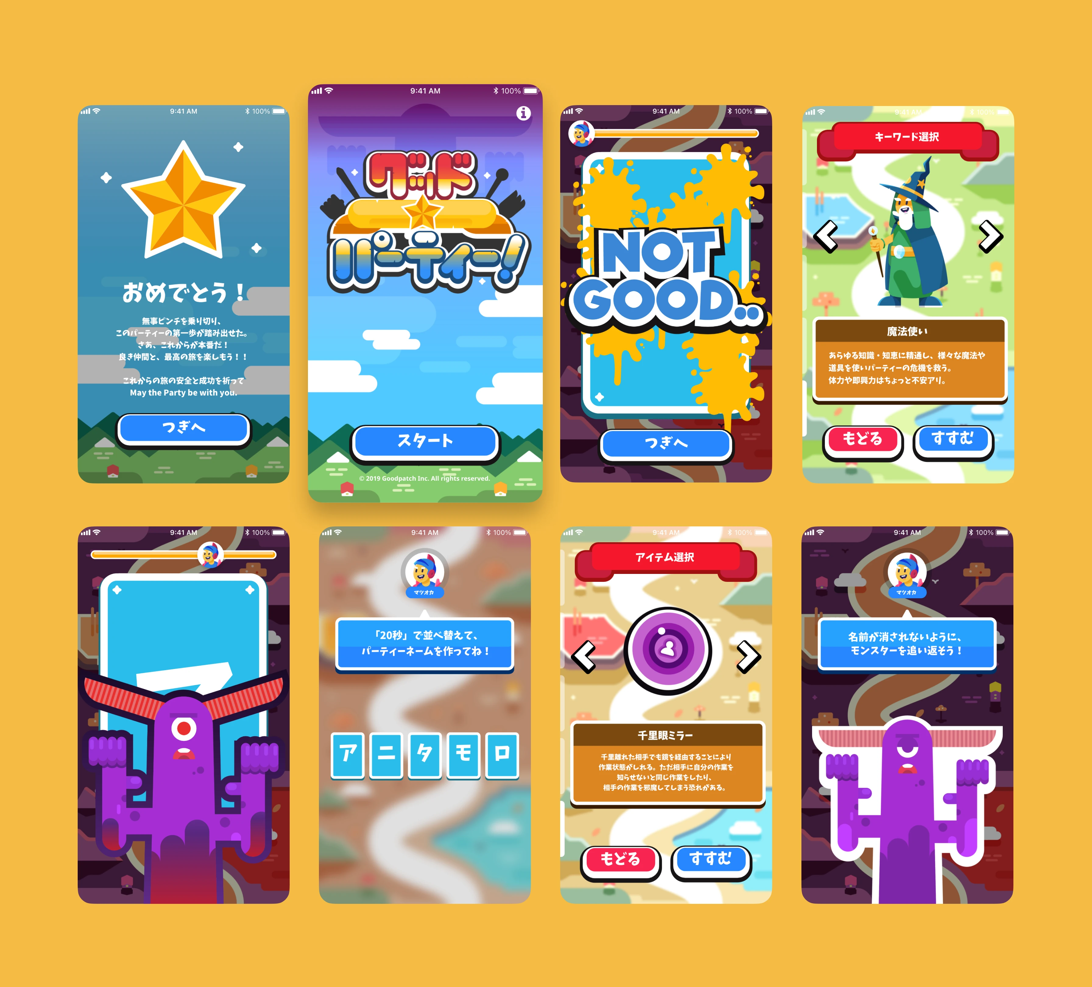 Goodparty is a RPG-like mobile application that facilitates interaction among team members of a newly started project, icebreaking so to speak. After starting GoodParty, team participants select a character and enter their own name. The first letter of each participant will be used to form the team name. The team must then combine those initials to determine their team name within a time limit, while monsters get in the way.