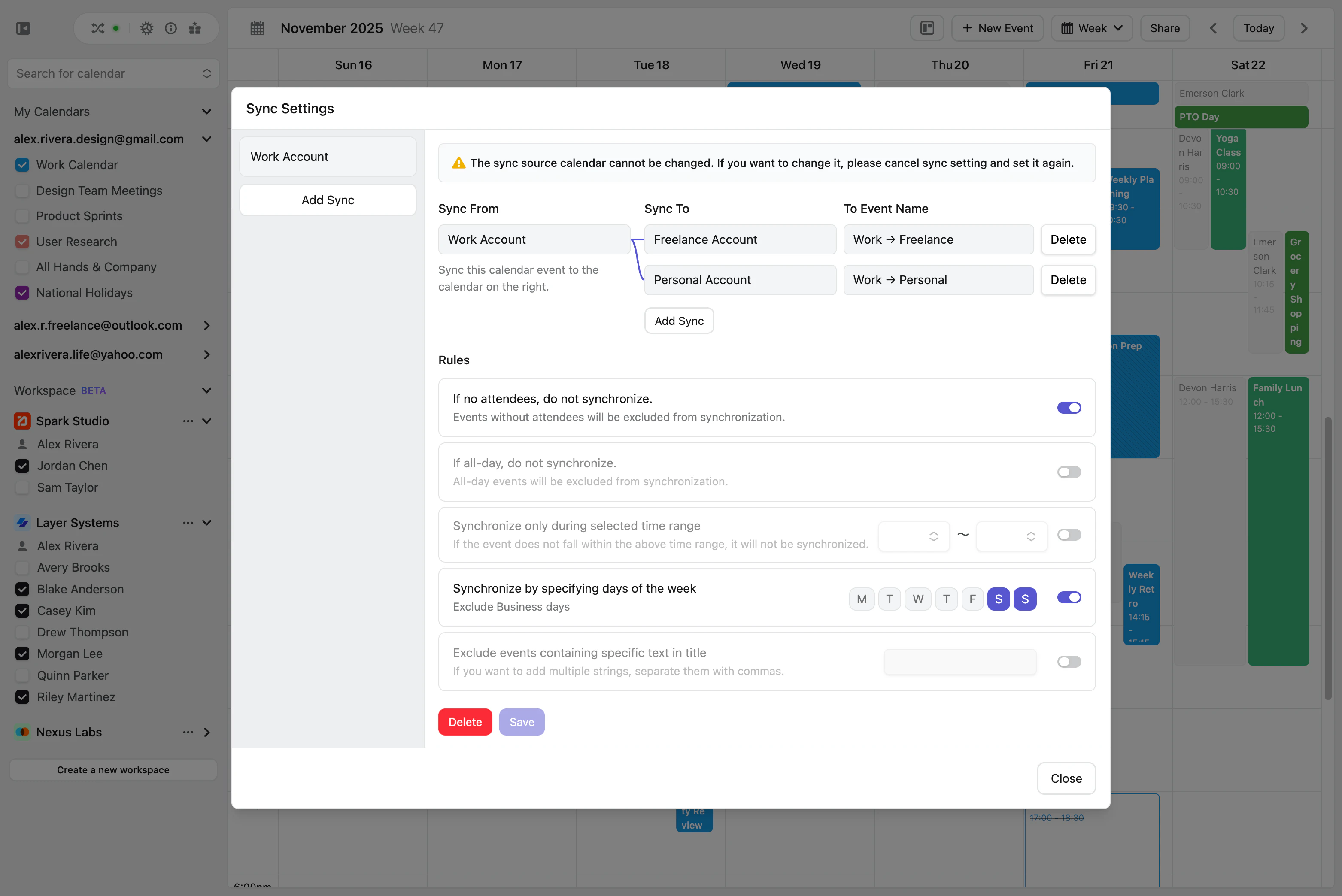 I redesigned this into a dialog-based interface that preserves visibility of the calendar at all times. This allows users to adjust settings while still anchored in their actual schedule, and see changes reflected in real time, which fundamentally improved continuity and user confidence.