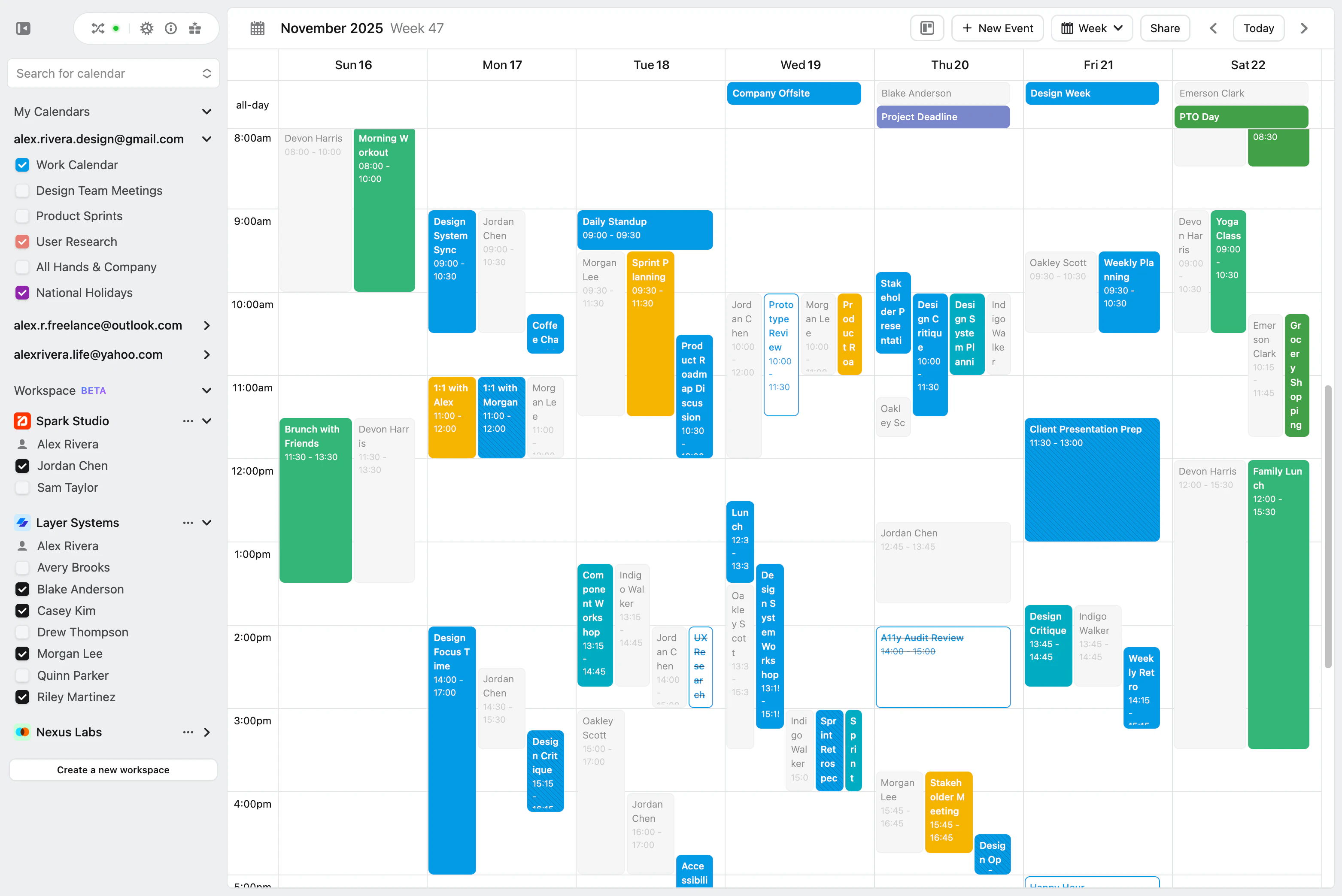 The need to manage multiple calendars is not unique to Lynx users—it is a common challenge among people who operate across several roles and communities: work, personal, freelance, and team-based collaborations. In Workspaces especially, projects often bring together people from different organizations. Designing a UI that allows visibility into everyone’s availability in one place became essential.